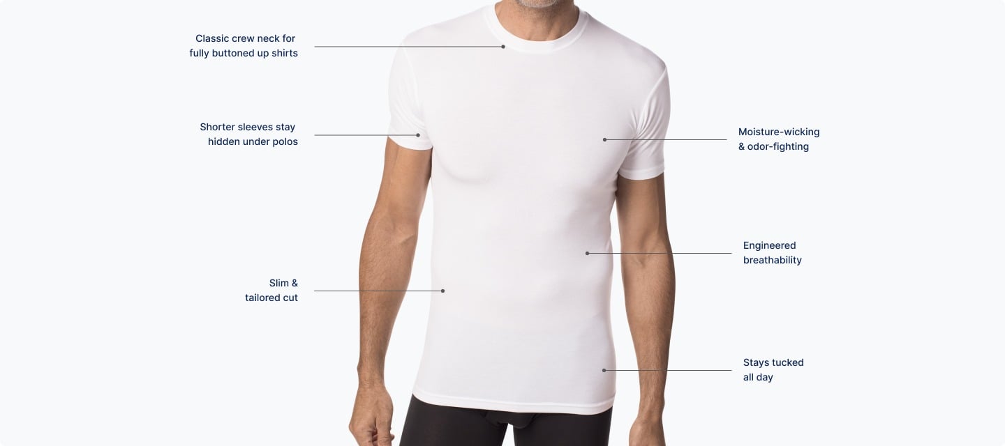 Our crew neck is perfect if you like to wear with your shirts fully buttoned up. Stay tucked and avoid embarrassing sweat stains with an incredibly soft, breathable feel.